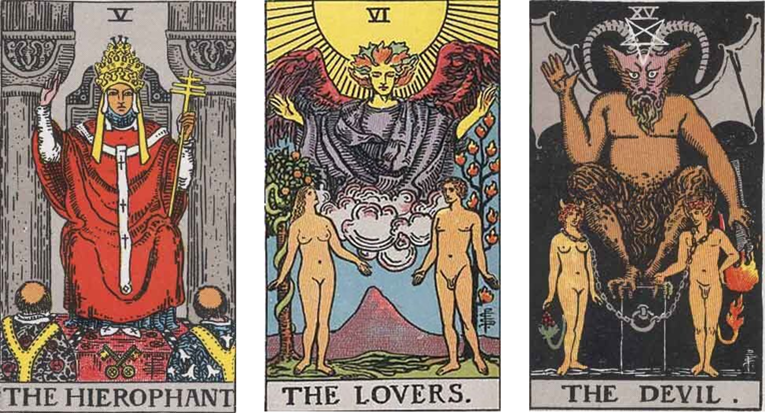 메이저 아르카나 15번, 악마 카드이다. 메이저 아르카나를 해석함에 있어 10번이 넘어가는 카드들은 수비학적으로 해석할때 앞의 두자리수를 더하기도 하는데, 이경우에는 1+5=6, 즉 6에 해당하는 카드와 대칭된다고 생각할수 있다. 실제로 6번 카드인 '연인'카드와 여러면에서 서로 대칭되는 모습을 보여주며, 추가적으로 5번 카드인 '교황'과도 구도적 유사함을 보인다. 연인카드에서는 천사가 벌거벗은 연인을 축복하는 모습이었다면, 악마카드에서는 악마가 나체의 연인을 쇠사슬로 묶고 있고, 교황카드와 악마 카드 모두 중앙의 중심 인물이 앉아있고 두 인물이 그 앞에 서있는 형태를 보이고 있다.