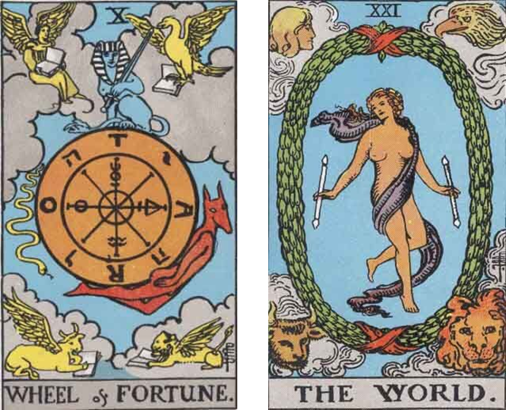10번 운명의 수레바퀴에 출현한 4개의 상징물, 즉 천사-독수리-사자-황소가 책(토라)를 보면서 공부(인간 세상에 대한 경험)를 하고 있었다면, 이제는 공부를 끝마치고 완성된 존재가 되어있다. 이전의 '20번 심판'과 연결지어 생각한다면, 신의 심판을 통과하여 완성된 존재가 되었음을 상징한다고 볼 수 있다.