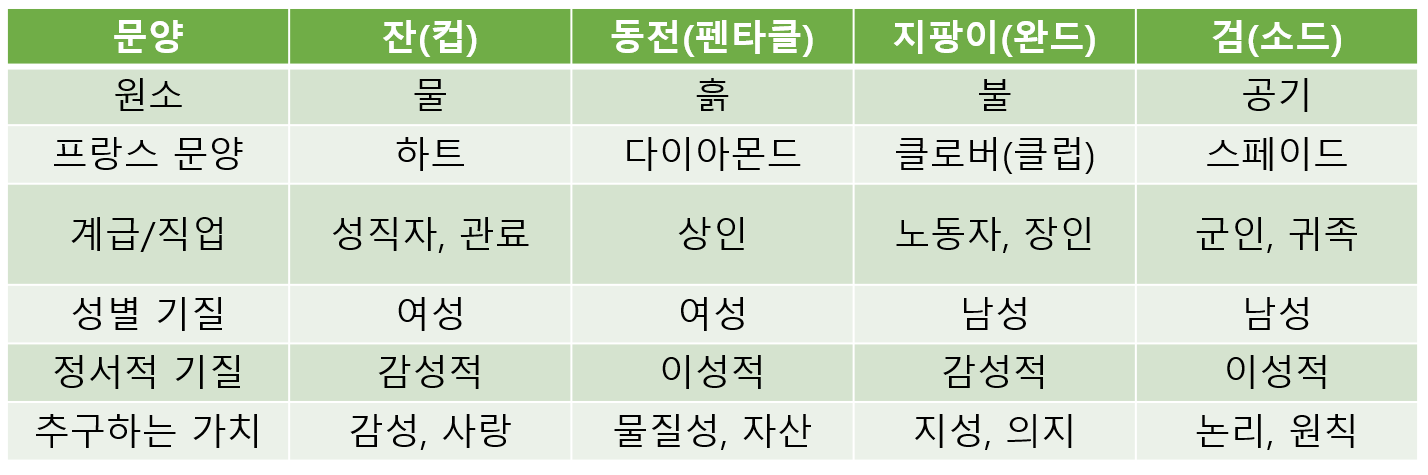 메이저 아르카나(Major Arcana)가 말 그대로 큰 흐름, 큰 비밀을 뜻한다면 마이너 아르카나(Minor Arcana)는 보다 작은 흐름, 사소하고 작은 사건들을 의미하고 있기에 메이저 아르카나만큼 하나하나의 숨은 깊은 뜻을 파헤치기보단 회화적 의미와 수비학적 의미에 집중해서 해석하는것이 보다 일반적이다. 그런만큼 각 문양(4원소)에 대한 의미와 숫자에 대한 의미(수비학)에 관해 간단히 표로 정리해봤다.