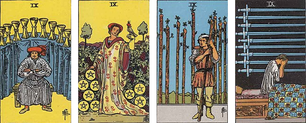 나인(Nine, 9)는 숫자 10에 도달하기 전 마지막 숫자로, 무언가의 끝을 의미하는 숫자이다. 끝은 그동안 이뤄온 것들의 종합과 이상을 이루는 성공을 의미할수도 있지만, 반대로 종말을 의미하기도 하기에 각 문양과 회화에 맞게 해석을 해야한다.