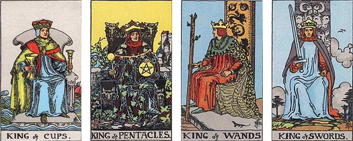 마이너 아르카나의 마지막 코트카드, 킹(King, 왕)은 40-50대의 남성에 해당되는 카드이다. 사장, 임원, 정치인 등 사회적으로 높은 위치에 해당되는 인물들이며 사회적 권위와 지위가 있는 인물이다. 아버지처럼 냉철한듯 자비로운듯한 모습이 담긴 카드들이다.