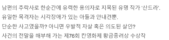 분명 법정 다툼중인데도 이상하게 웃거나 개인 변호사인 '뱅상'과 너무나도 친근하게 행동하는 '산드라'의 모습, 분명 4살 때 시각을 거의 잃었다고 했음에도 가끔씩 무섭게 동공이 정확하게 카메라를 항햐는 '다니엘'의 얼굴, 묘하게 자주 카메라에 포커스되는 '스눕'의 모습은 영화 내 등장하는 묘한 음악과 더불어 계속해서 반전이 있을 것만 같은 느낌이 들게 한다. 마치 '저거 진짜 산드라가 범인 아니야?', '다니엘 사실 앞을 볼수 있나?', '안내견 스눕이 사실 떨어트린건가?'와 같은 의문을 계속 가지게 한다는 것이다. 물론 영화에서는 결국 '사뮈엘'의 자살로 결론이 난다. 여러 정황적 증거와 더불어 아들인 다니엘의 증언까지 모든 사실이 그것을 뒷받침한다. 그럼에도 불구하고 영화 내내 이러한 의문이 들게하고, 법정다툼이 끝난 후 영화가 마무리되기까지의 마무리 10분간의 영화 시퀀스를 보면 끝까지 묘한 씁쓸한 뒷맛이 들게 하는 것은 분명 감독의 의도라 생각한다.