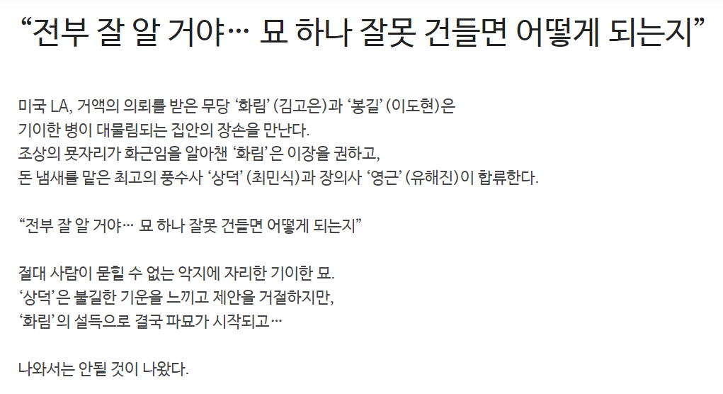2024.03.02 신촌 메가박스에서 관람한 '파묘' 리뷰이다.