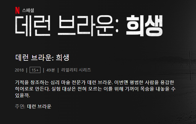 영국의 마술사이자, 세계적인 거장 멘탈리스트 중 하나인 데런 브라운(Derren Brwon)가 2018년 진행한 넷플릭스 오리지널 시리즈, '희생'이다.