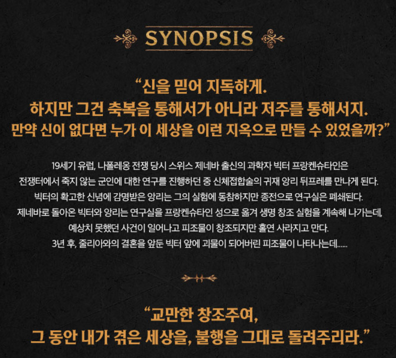 뮤지컬 <프랑켄슈타인>은 세계 최초의 SF 소설가인 '메리 셸리' 작가의 소설, '프랑켄슈타인'을 원작으로 하는 국내 창작 뮤지컬로 충무아트홀 개관 10주년 기념으로 제작된 뮤지컬이다. 원작의 큰 줄기를 거의 그대로 따라가며(소위 '북극'까지..) 주연배우 6명이 모두 1인 2역을 하는 것이 이색적 특징. 대략적인 줄거리는 아래와 같다.