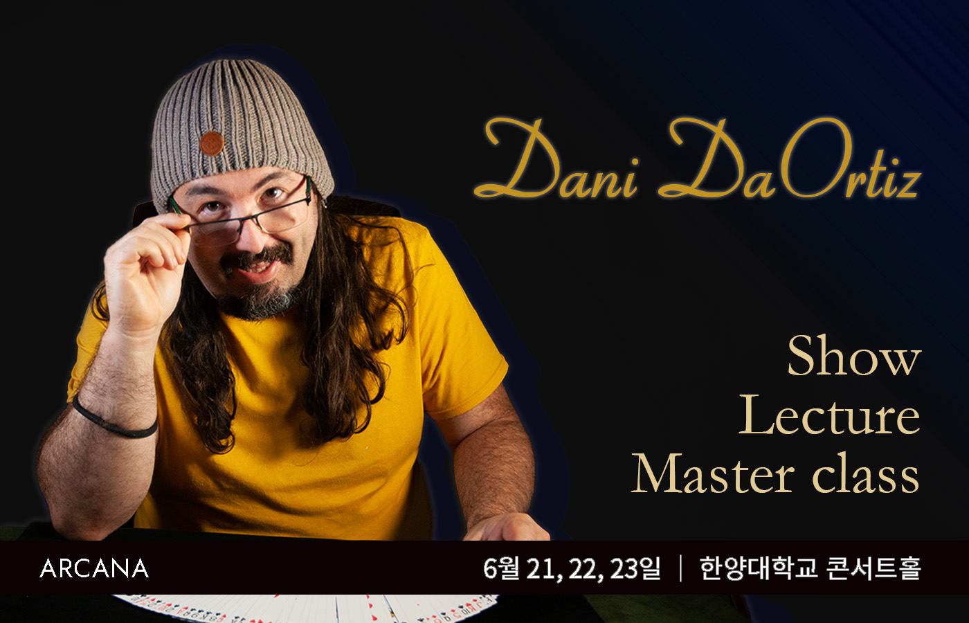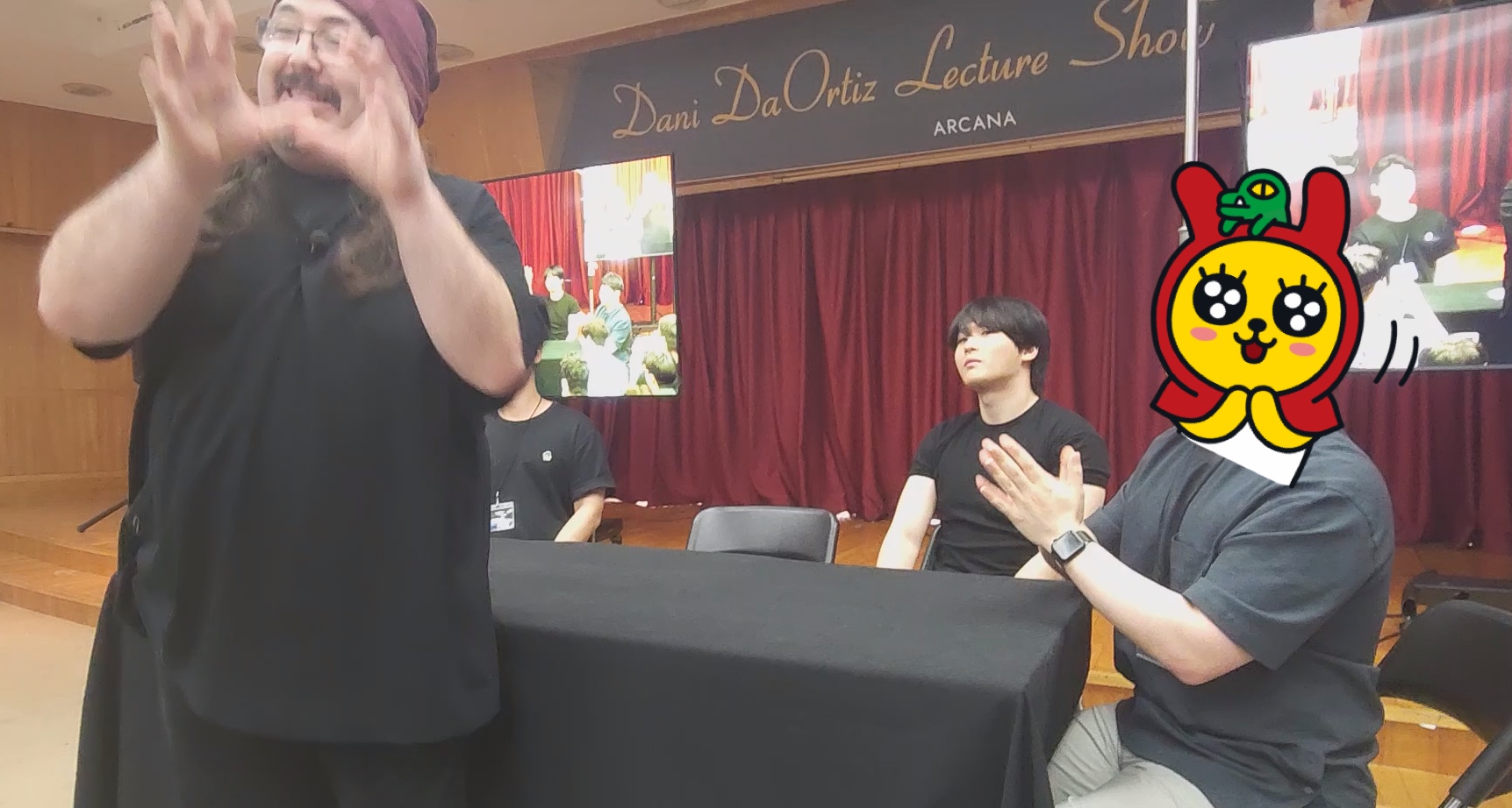 처음 한시간은 '100% Daortiz'라는 이름의 다니 공연시간이었다. 마스터 클래스 때는 보고 싶은 것을 물어본 후 그것을 말 그대로 퍼포밍하는 식이었다면, 이번에는 다니가 준비(?)해온 것들을 보여준 시간이었다. 다만 그때 그때 관객의 덱을 빌려서 활용하기도 하고, 상황에 맞춰 즉흥적인 루틴들을 보여주는 느낌은 여전하여(실제로 다니는 이렇게 공연을 한다고 한다. 역시 짬에서 나오는 바이브..) 보는 내내 너무나도 즐거웠다. 특히 이번에는 자원해서 다니 옆에 앉는 관객으로 참여했는데, 옆에서 봐도 신통방통한 그의 마술을 보면서 보는 내내 입이 다물어지지 않을 지경이었다. 나중에 알게된 것인데, 마스터클래스-렉처쇼 이틀 총 3일을 모두 참여한 다른 분의 말에 따르면 매일 보여준 루틴들이 다 달랐다는 것을 알게되었을 때엔 충격이 배가 된 기분이었다.
