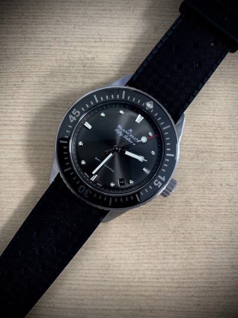 사실 피프티패텀즈는 최초의 상용화된 근대식 다이버시계라는 점에서 그 상징성이 있고, 블랑팡이라는 브랜드 자체가 내게는 호감이었기에 좋은 인상이 있던 모델이었다. 다만 기본 사이즈가 45mm로 내겐 너무 컸고 처음 명제인 '존재감이 너무 튀지 않고 나를 받혀줄 데일리 시계'를 찾는 목적에는 부합하지 않아 아예 배제하고 있었는데, 우연히 들린 매장에서 이 바티스카프를 처음 본 후 한눈에 반해버렸다.