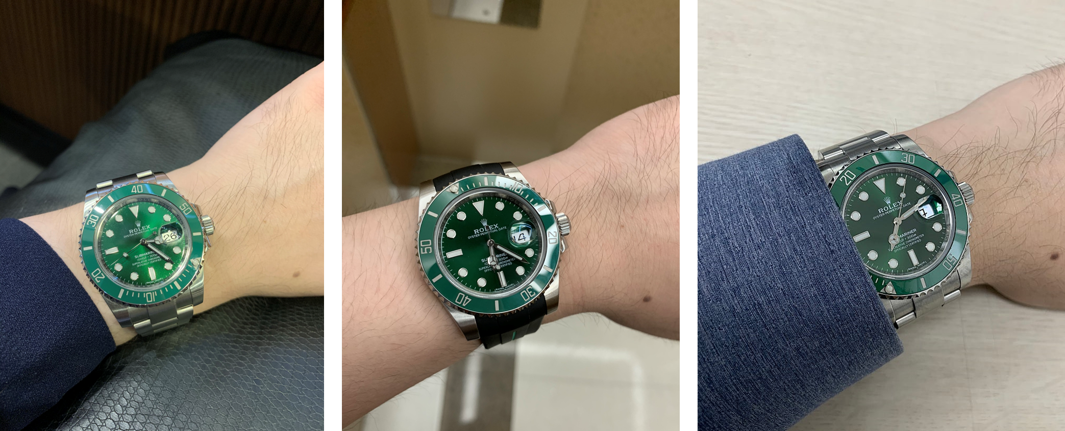 그렇게 찾던 와중 시계모임이 아닌 타 모임에서 만난 분(알고보니 시덕이었던 분)의 손목에 올라와있던 시계가 바로 롤렉스 서브마리너 그린 헐크였다. 사실, 헐크의 존재 자체를 모르던 것은 아니었다. 서브마리너 발매 50주년 기념으로 나온 첫 그린 모델이었던 16610LV (속칭 커밋) 등에 대해서도 알고 있었으며 (그당시로서는) 신형인 헐크에 대해서도 와치홀릭 등에서 자주 봤기 때문이다. 다만 '검은색 다이얼 - 그린 알루미늄 베젤' 인 커밋과 다르게 '그린 다이얼 - 그린 세라믹 베젤'을 가진 헐크는 부담스럽다 못해 너무 과하게 느껴져서 한번도 내 위시리스트에 올려본적이 없었다. 두꺼워진 크라운가드/러그에 대한 불호는 덤.