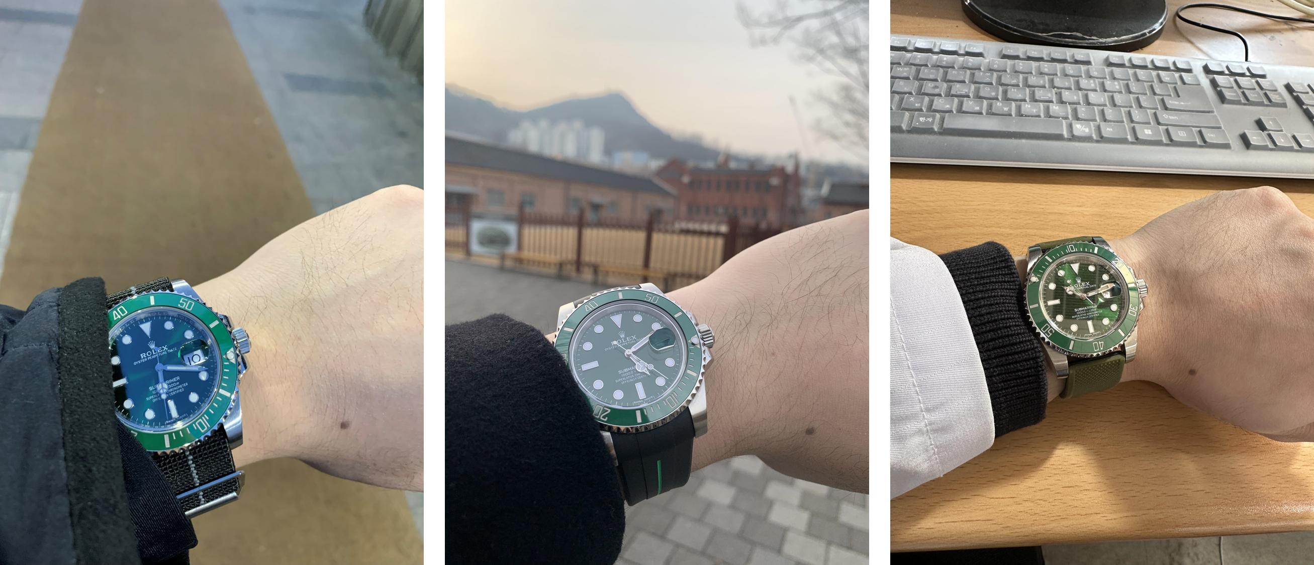 롤렉스 스포츠모델들은 종류무관하게 브레이슬릿이 가장 잘 어울린다고는 하지만, 헐크는 그린-그린 조합때문인지 그 단점이 유난히 부각되는 것 같다. 신형 브레이슬릿의 무게가 상당하기 때문에 F/W 시즌에는 조금 가벼운 줄질을 하고 싶은데 그 어떠한 줄질과도 크게 어울리지 않는 것은 참 아쉽던 점. 최후의 보루 수단으로 롤렉스 정품 쥬빌레 브레이슬릿을 구해서 착용해볼까도 고민했지만(63600 슈퍼 쥬빌레 / 62150H + 502T 조합) 200만원의 가격을 주고 브레이슬릿을 굳이.. 싶어서 포기.