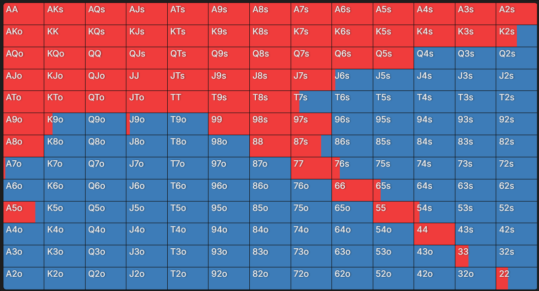 2번 이유야 그렇다 쳐도, 1번은 정말 말도 안되는 이야기라고 단언할 수 있다. 애초에 이것은 GTO, 즉 게임이론(Game Theory Optimal)에 기반한 레인지표이기 때문에, 당신이 이 표대로만 플레이한다면 상대의 행동과 무관하게 언제나 정해진 상황에서 최적의 결과값을 얻어낼 수 있다. 그것이 게임이론이니까.(물론 레이크가 없을 때 기준)