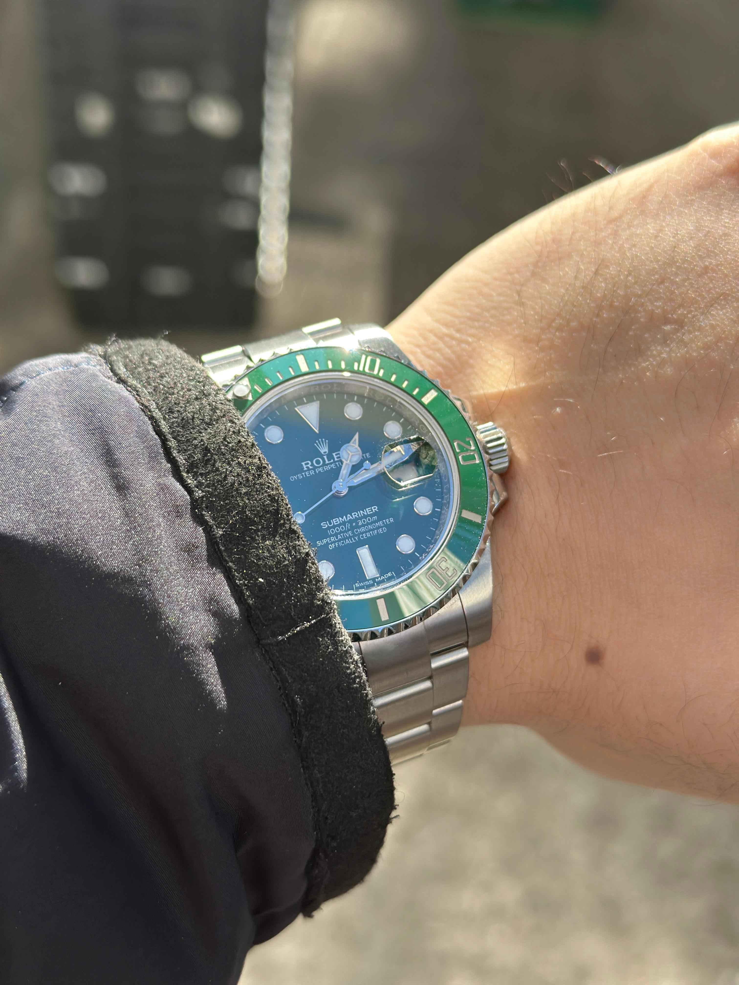 그러나 실물을 보면 이 썬레이 다이얼이야 말로 헐크 모델의 가장 큰 매력이라고 할 수 있다. 빛의 양에 따라 블랙그린부터 쨍한 느낌까지 다양한 색감을 보여주기 때문이다. 며칠 전 외출했다 찍은 사진들을 몇장 첨부하며 글을 마친다.