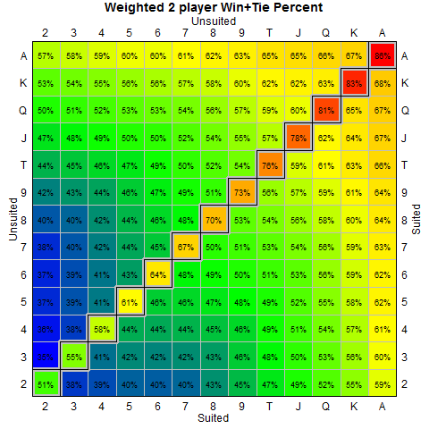 이쯤에서 모든 포커 핸드의 프리플랍-쇼다운 까지 갔을 때의 승률표를 보자.(단, 아래의 상황은 승리+무승부를 합한 확률이기에 아주 정확하지는 않다. 대략적인 느낌만 봐두자.)
