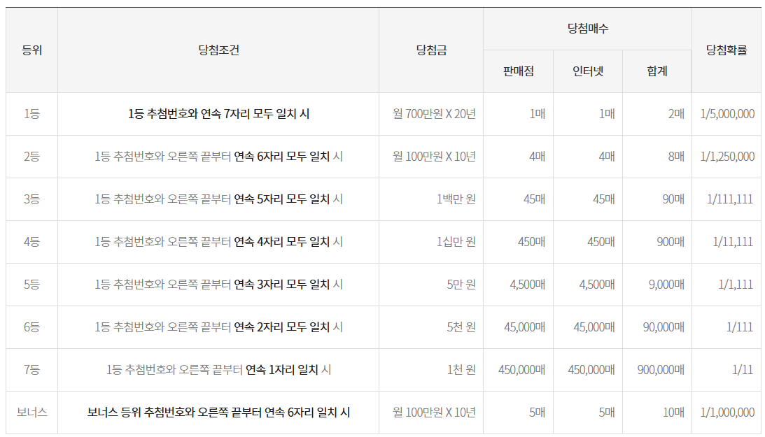 한가지 재밌는건 1등과 2등의 당첨구조이다. 6자리가 모두 같을 때 맨 앞의 조를 맞추느냐 마느냐에 따라서 1등과 2등이 갈리기에 보통 구매할때 6자리의 숫자를 고정하고 앞의 조만 바꿔서 구매한다. 즉 6자리 숫자가 314159라고 하면, 1조 314159 부터 5조 314159까지 다 구매한다는 것.