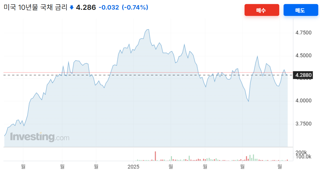 참고로 최근 미국채 금리는 4% 이상의 금리를 유지중이며 이는 상당히 높은 수치이다. 물론 여러가지 요소가 작용할 수 있지만, 가장 마지막 이벤트는 뭐니해도 미-중 무역 전쟁. 실제로 위 그래프에서도 발표 직후에 급격하게 상승하는 것을 볼 수 있다. 즉 안전자산이라고 하는 미국채조차도 영원하지 않으며 얼마든지 흔들릴수 있다는 것을 잊어서는 안된다.