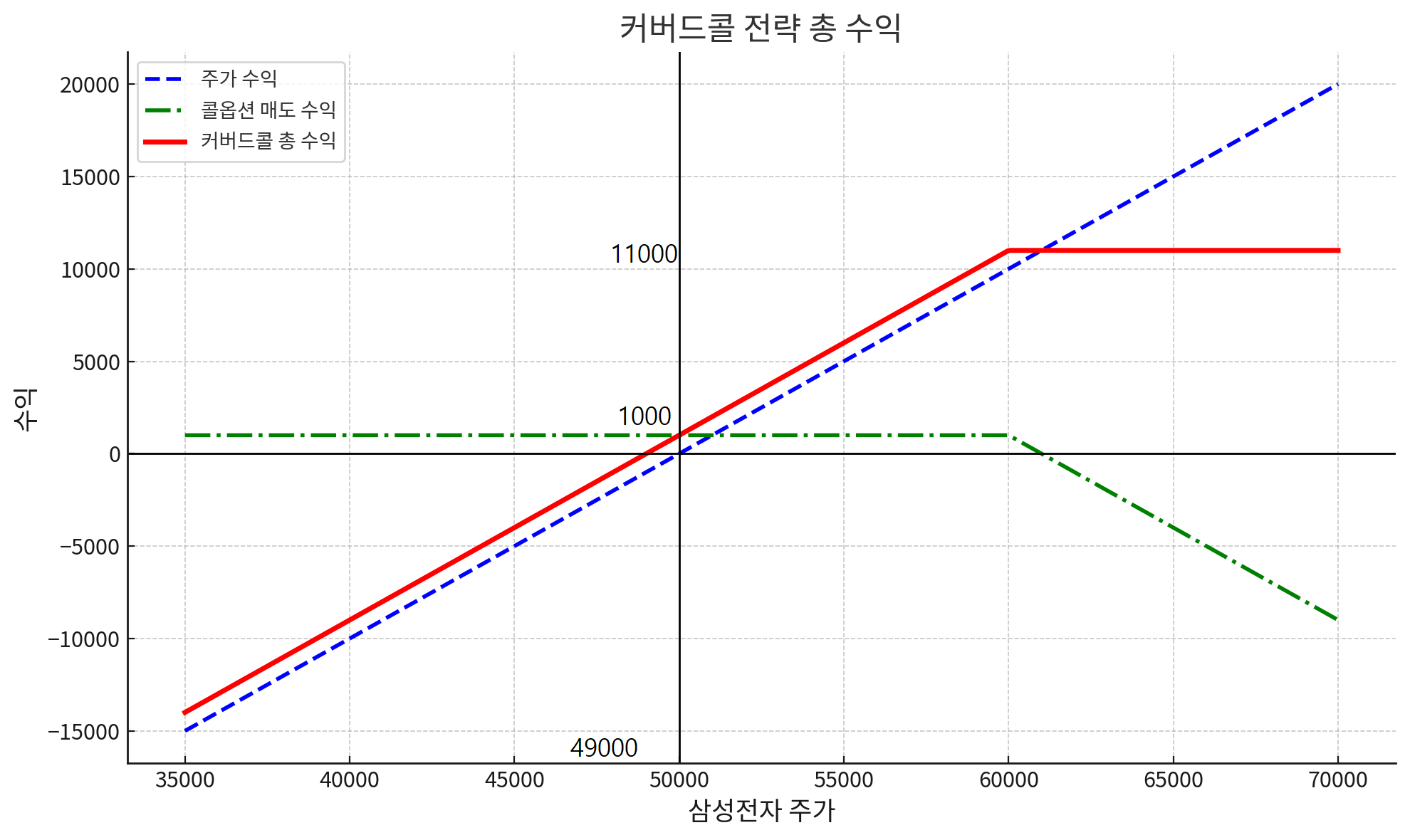 이때 삼성전자를 1주 사면서 동시에 상기 콜옵션을 생성하여 매도하는 것이 커버드콜의 운용방식이다. 여기서 한가지 의문이 들수 있다. 상기 콜 옵션은 매수자 입장에서 1년 뒤 삼성전자의 주가가 올라서 60,000원 이상이 되어야만 권리를 주장하여 수익을 얻을 수 있다. 그럼 주가가 오른다고 기대를 한다는 것인데, 그럴거면 콜옵션이 아니라 주식을 사면 되지 않나?