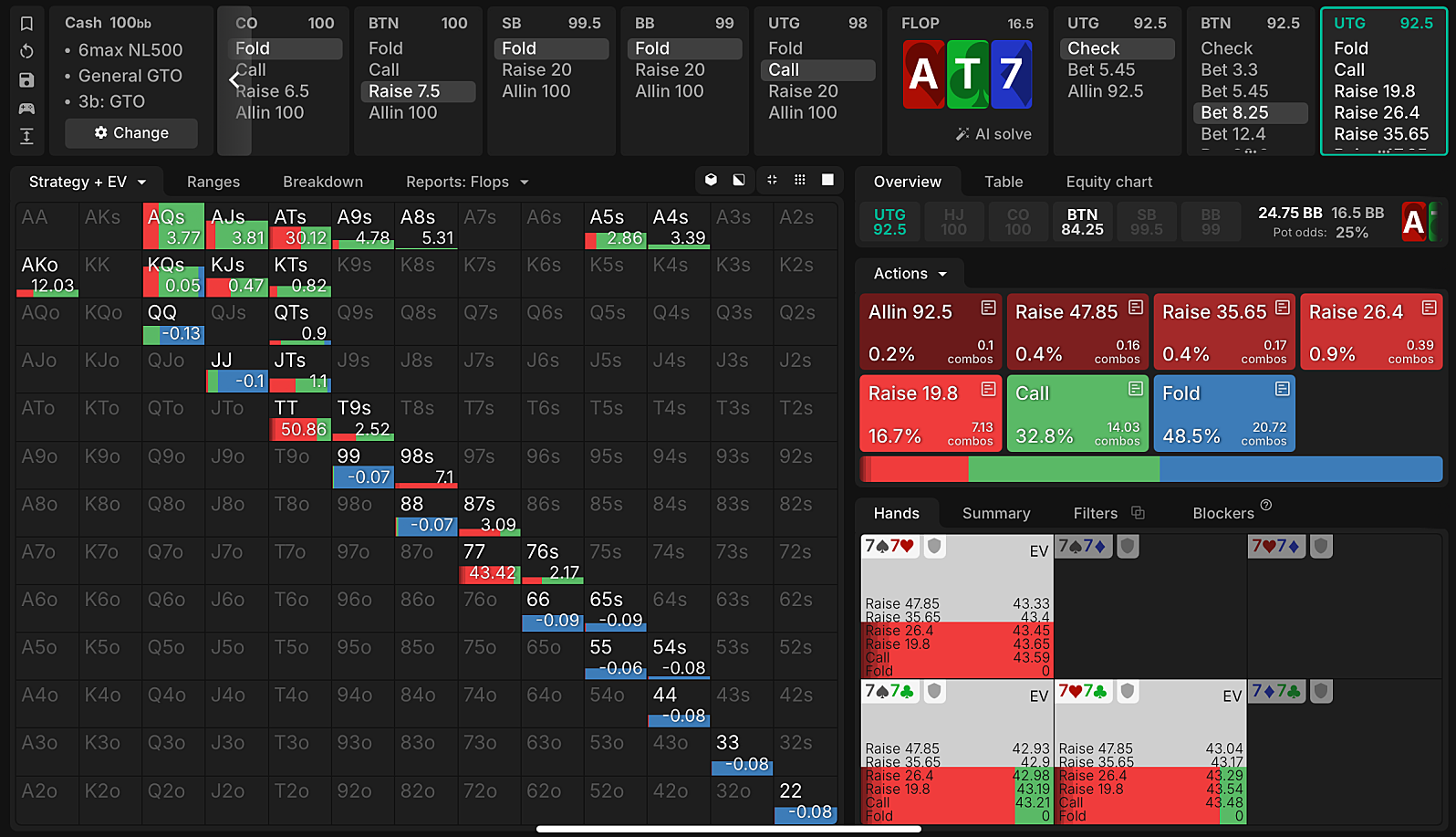 이는 확실히 3bet한 BTN에게 유리한 보드이다. UTG가 체크로 넘기면 매우 높은 빈도로 BTN은 c-bet할것이고, 우리는 이에 콜/레이즈 하면 된다.(두 전략은 무차별하다. 아래 사진 참조)