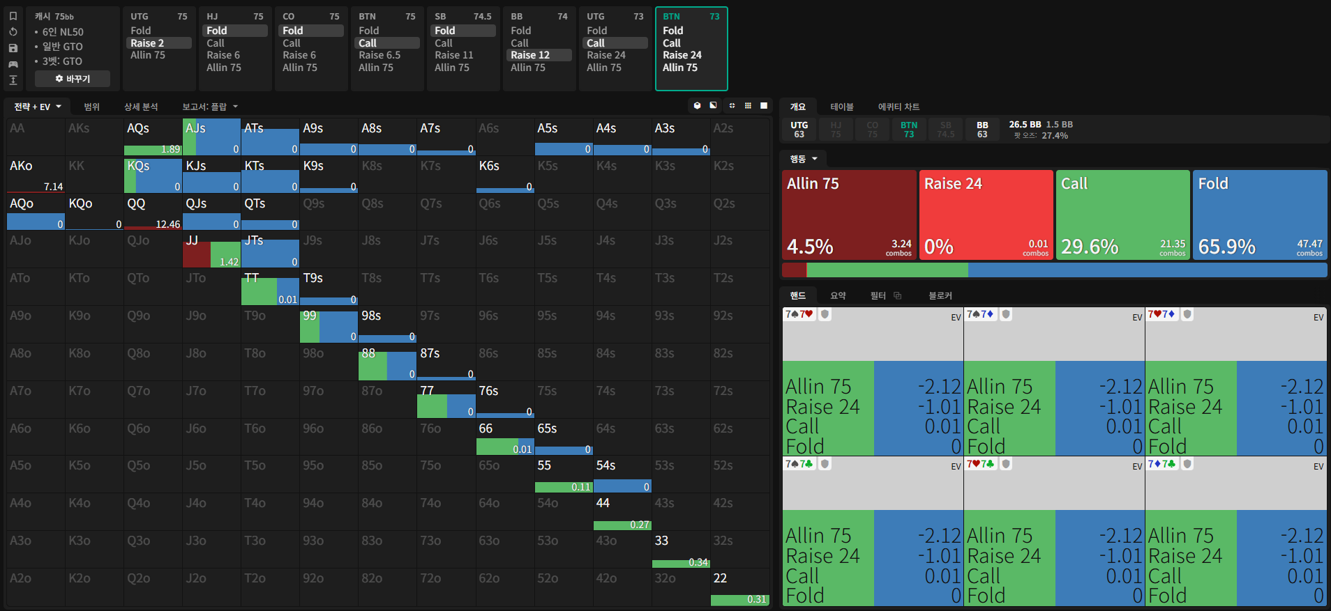 이 상황에서의 GTO 전략은 아래와 같다.
