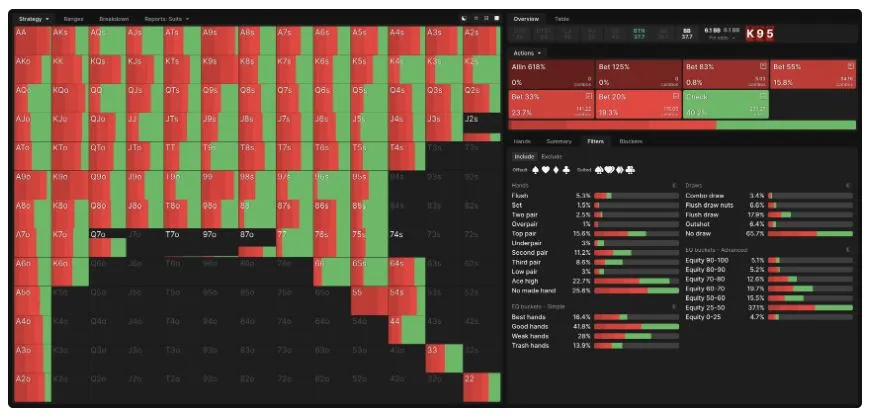 위에서 말했듯 문양과 무관하게 K95 플랍은 BTN에게 유리하기에 거의 모든 2장의 카드로 수익적인 블러프가 가능하다. 즉 스탠다드하게 작은 사이즈 c-bet이 가능하며, 체크는 오로지 팟이 커졌을 때 최악의 결과를 보여주는 카드들에 집중된다. 바로 하트가 없는 미들 페어(이 경우 QQ JJ TT 등)