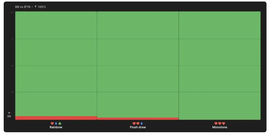 모노톤 여부와 무관하게 프리플랍 어그레서는 대부분의 플랍에서 에퀴티 어드밴티지를 가지기에, 약 70%정도의 빈도로 c-bet을 날리곤 한다. 다만 모노톤 플랍의 경우 팟이 커질수록 플러시 카드가 중요해지기에, 충분히 균형잡힌 경우라면 프리플랍 어그레서는 일반적인 플랍보다 더 작은 사이즈의 c-bet을 선호한다. 가장 자주 나오는 BTN vs BB 100BB 상황을 모든 종류의 플랍에 대해 고려해보자.