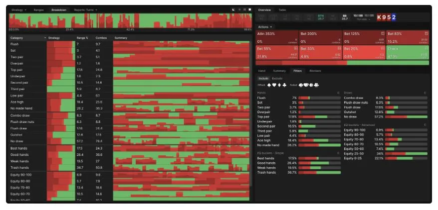 위에서 말했듯 문양과 무관하게 K95 플랍은 BTN에게 유리하기에 거의 모든 2장의 카드로 수익적인 블러프가 가능하다. 즉 스탠다드하게 작은 사이즈 c-bet이 가능하며, 체크는 오로지 팟이 커졌을 때 최악의 결과를 보여주는 카드들에 집중된다. 바로 하트가 없는 미들 페어(이 경우 QQ JJ TT 등)