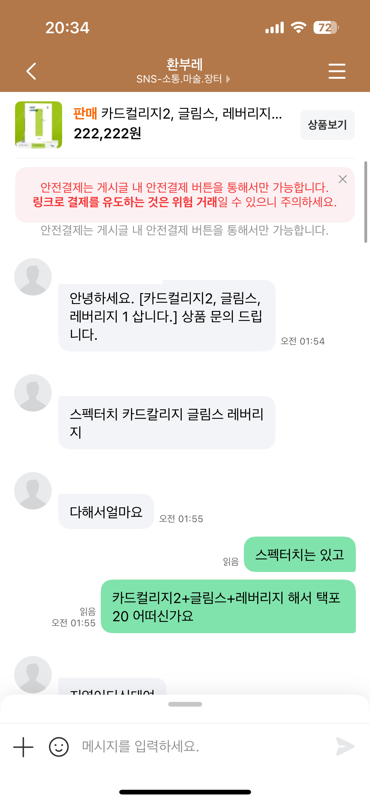 일반적으로 판매글을 올릴때 보다 구매글을 작성할때 사기꾼들이 더 많이 꼬인다는 것은 알고 있었고 실제로 이전에도 몇번 당하기 직전까지 갔었기 때문에, 거래에 있어 주의를 해야한다는 사실은 인지하고 있었다. 그러던 중 한 유저가 내게 채팅을 걸어오고, 이 사람이 이번 사기사건의 주인공되시겠다.