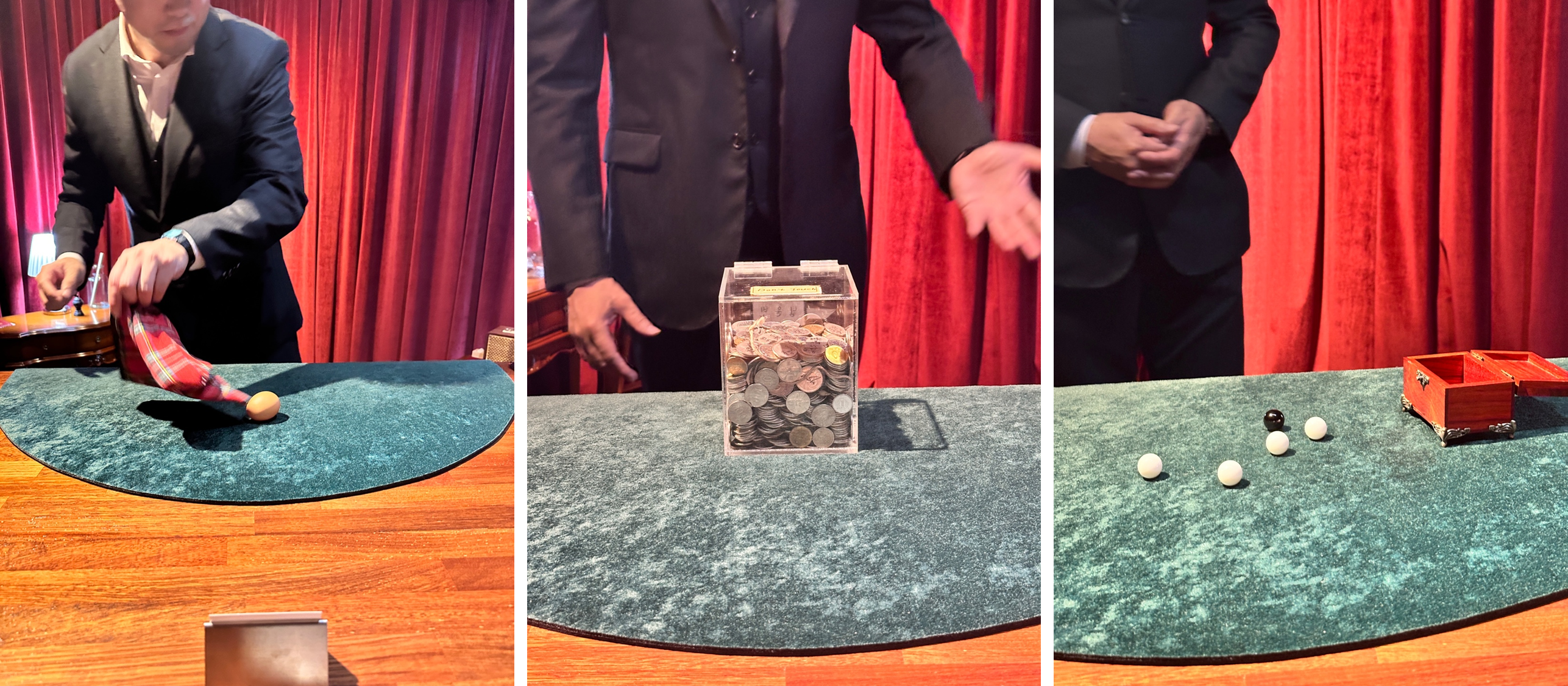'미스터 펄' 마술사의 자기소개 마술로 시작된 공연은 총 70분동안 진행되었다. 익숙한 카드마술부터 시작해서 에그 백, 쿠로스케, 동전마술 등 다양한 소재를 이용한 공연이 진행되었다. 한가지 특이한 점은 공연 도중 사진촬영이 얼마든지 허용된다는 것? 일반적인 마술공연에서는 해법 노출등을 막기 위해 사진촬영이 금지되는 것을 고려하면 상당한 자신감이 엿보이던 요소였다. 실제로 나도 공연 중간중간 촬영을 하긴 했지만, 대부분의 시간동안 공연에 매료되어 사진 찍을 생각을 못하고 넘어간 것도 많았다. 아래는 공연 중 중간중간 생각날때마다 찍은 사진들(급하게 찍는지라 일부 흔들림이 있다. 사실 블로그에 리뷰할 생각만 버렸다면 사진은 찍지도 않고 공연에만 온전히 집중했을듯.)