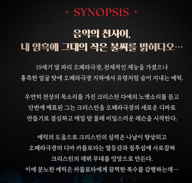 다만 앤드루 로이드 웨버가 만든 '오페라의 유령'이 웨스트엔드에서도, 영화계에서도 대히트를 친지라 의도치 않은 콩라인...이 되어버린 뮤지컬. 다만 특유의 무대세팅, 그리고 2부의 발레가 독특한 매력이 있어서 이쪽이 취향인 편도 있는 편. 대략적인 줄거리는 아래와 같다.