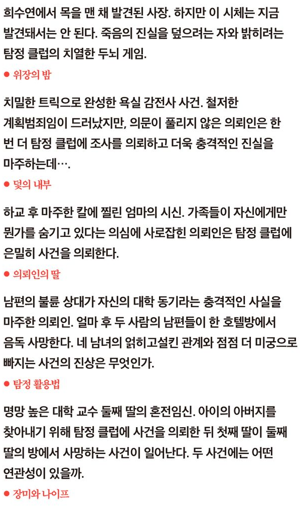 '나미야 잡화점의 기적', '용의자 X의 헌신', '녹나무의 파수꾼' 등 다양한 작품으로 유명한 히가시노 게이고의 초기작 '탐정 클럽' 시리즈를 새롭게 펴낸 이 작품은 총 5개의 단편으로 구성되어 있다. 그의 초기 작품 세계를 엿볼수 있으면서 장르적 재미가 있다고 주변에서 추천을 받아 밀리의 서재로 감상.