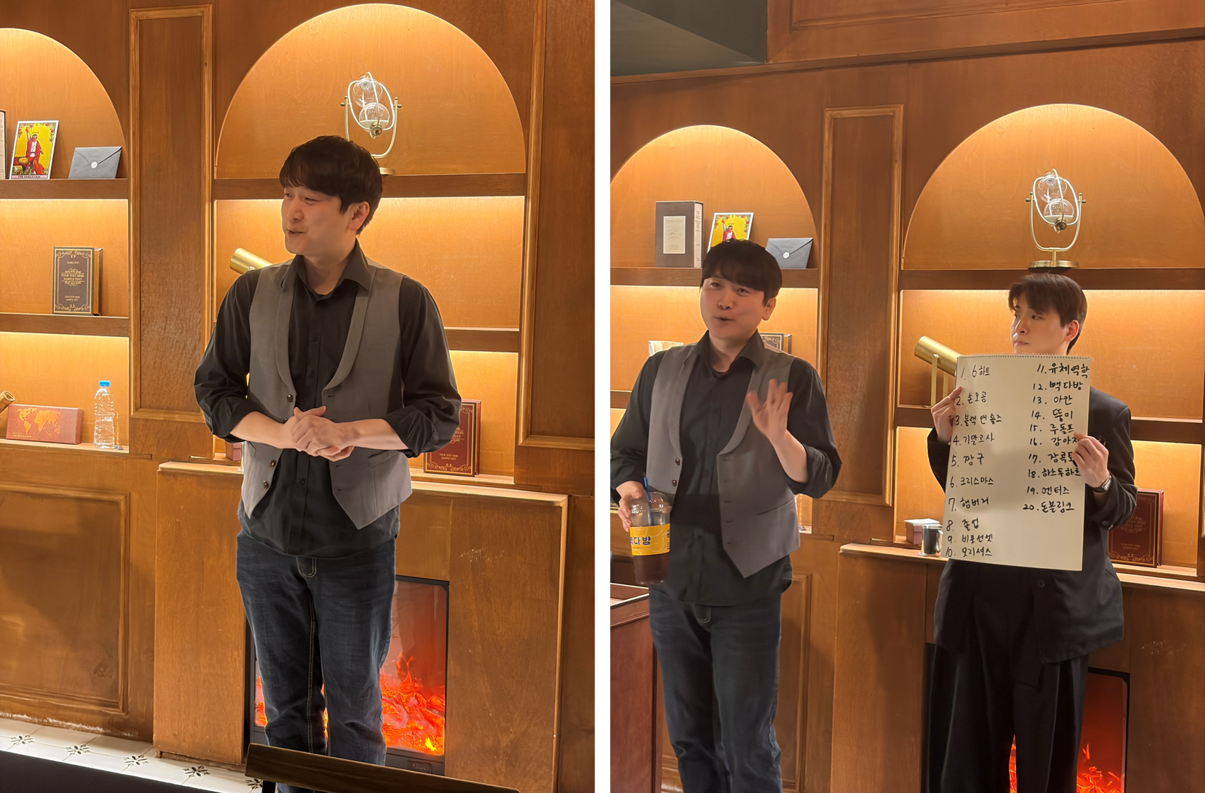 먼저 나오신 ALT, 이영우 마술사는 메모라이즈 루틴을 보여주었다. 사진에 나온 것처럼 1번부터 20번까지 관객들이 임의로 말한 단어를 붙이고 그것들을 외우는 퍼포밍인데, 해법이 말 그대로 외우는 것...이기 때문에 어쩌면 더 놀라운 마술. 일반적으로 이 마술을 하면 의자 / 연필 / 핸드폰 등 쉬운 단어들을 붙이기 마련인데, 오늘은 마술인 관객들이 모인 만큼 '블랙 앤 숄즈 모형', '장 콕토', '모리셔스' 등 각종 억까와 헤클러짓(물론 나 포함)이 등장했다. 그럼에도 그것을 극복하여 보여주신 것이 인상적.