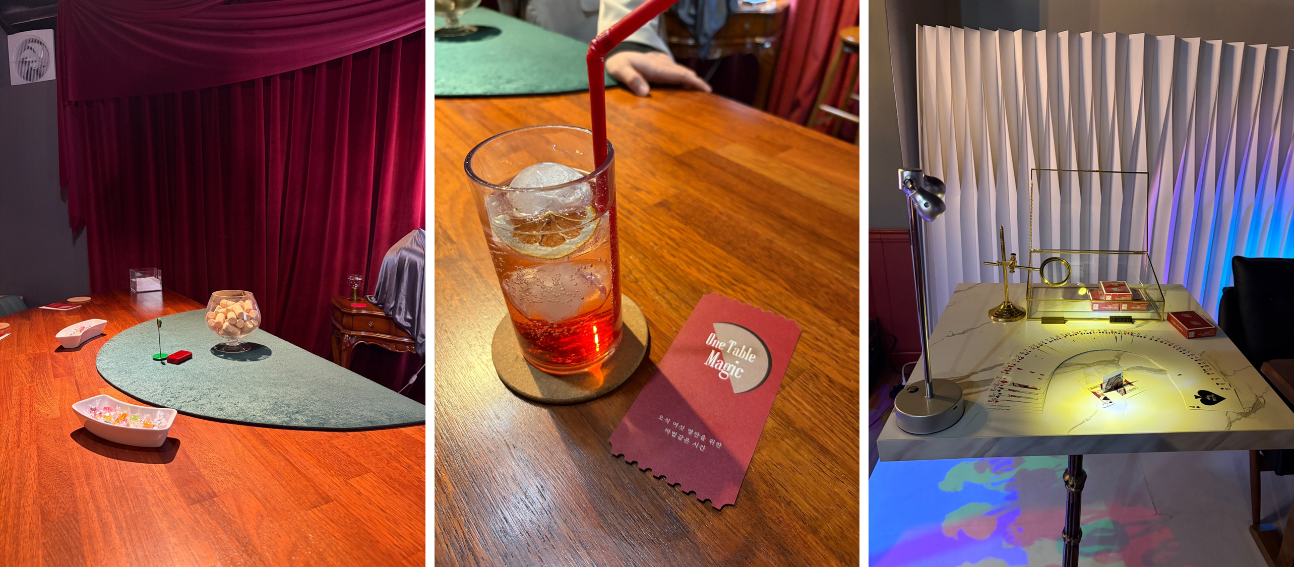 공연은 시작 20분 전부터 입장이 가능하며, 내부로 들어서는 순간 잘 꾸며진 공간이 관객을 맞이한다. 마치 20세기 초의 마술 공연장을 찾은 듯한 분위기와, 이제는 거의 사라진 매직바 특유의 감성이 동시에 느껴지는 공간이었다. 자리에 앉아 시원한 웰컴 드링크를 즐기고 있노라면, 어느새 자연스럽게 공연이 시작된다.