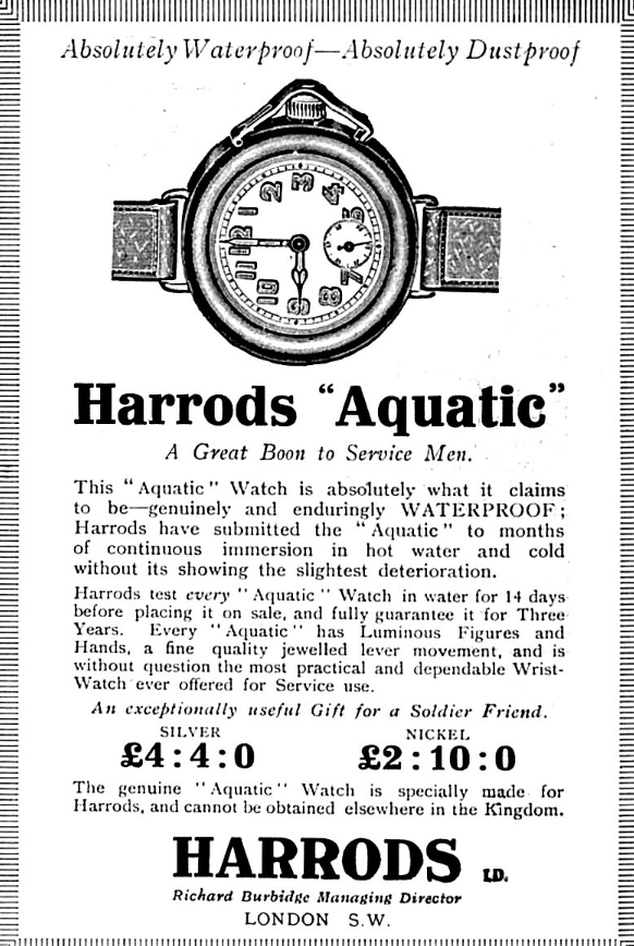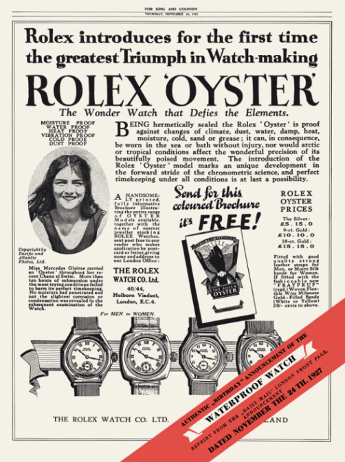 (영국시계연구소의 저널에 실리기도 한 Brook&Son의 Submarine 방수시계가 최초의 방수 손목시계로 보기도 하지만, 광고지나 기록 외 실물의 보존이 명확하지 않아서 논란이 있다)
